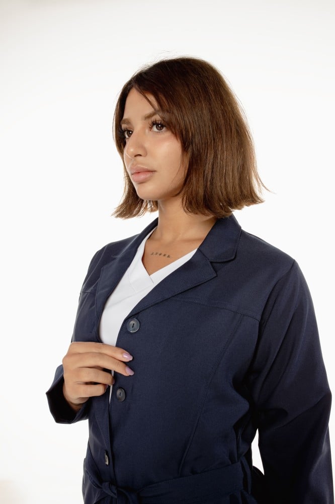 يتكون بالطو إزاري كحلي من نسيج البوليستر القوي الذي يعكس متانة الملابس وقدرتها على التحمل, وهذا مايجعله مناسب للاستخدام اليومي ولساعات طويلة. كما أنه يتميز بتصميمه العملي والأنيق ليتناسب مع جميع الأذواق. يحتوي بالطو إزاري كحلي على حزام قابل للإزالة لضبط ملاءمة البالطو حسب الحاجة أو اضافة لمسة من الأناقة, وأزرار كبيرة و 2 جيوب أمامية لتخزين الملحقات والأدوات اللازمة.