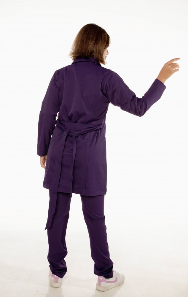 يتكون بالطو ردائي بنفسجي من نسيج البوليستر الناعم والمرن الذي يعكس نعومة ومرونة الملابس وقدرتها على التحمل, وهذا مايجعله مناسب للاستخدام اليومي ولساعات طويلة. كما أنه يتميز بتصميمه العملي والأنيق ليتناسب مع جميع الأذواق. يحتوي بالطو ردائي بنفسجي على حزام قابل للإزالة لضبط ملاءمة البالطو حسب الحاجة أو اضافة لمسة من الأناقة وأزرار كبيرة و 2 جيوب أمامية لتخزين الملحقات والأدوات اللازمة.