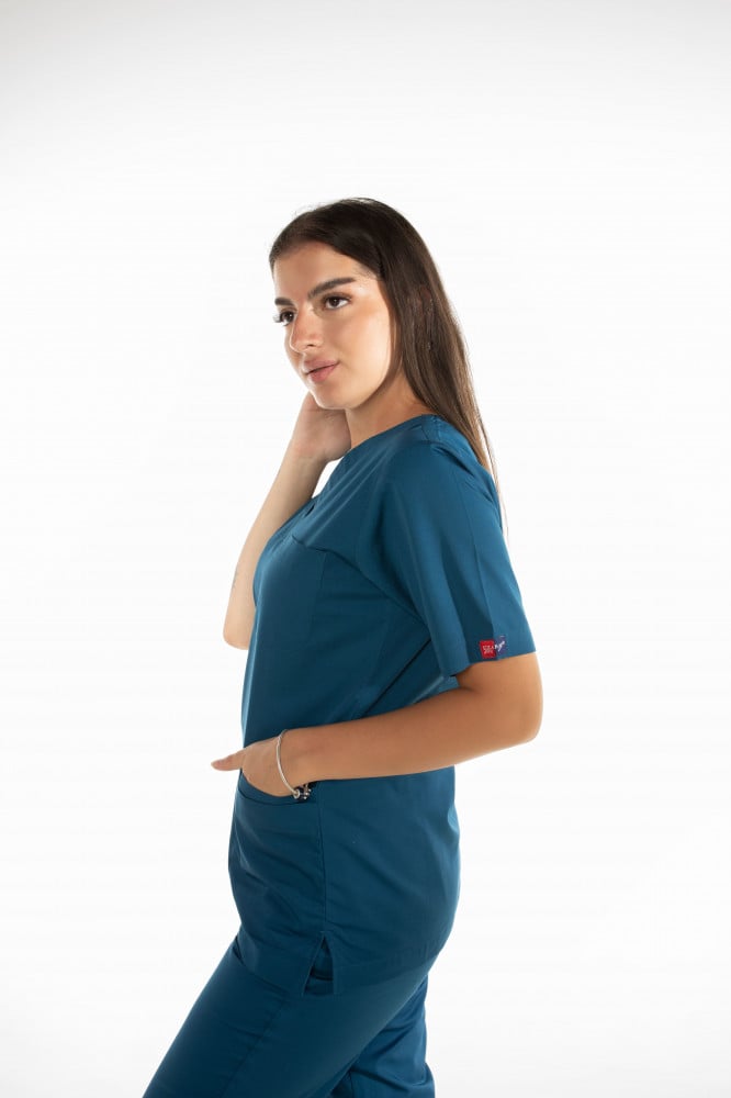 يتكون سكراب إزاري الأنيق أخضر غامق من مزيج مثالي من نعومة القطن ومتانة البوليستر, كما أنه متين بما يكفي لتحمل الاستخدام اليومي. يتكون من بلوزة مريحة، عملية، وسهلة الارتداء تحتوي على ثلاثة جيوب لتخزين الملحقات والوصول إليها بسهولة، وبنطلون يوفر حرية في الحركة ويسمح للجسم بالتنفس ويحتوي على جيب جانبي عريض للأدوات اللازمة. كما أنه تم تصنيعه من خامات ذات جودة عالية، بحيث يمكن الحفاظ عليه في حالة جيدة لفترة طويلة.